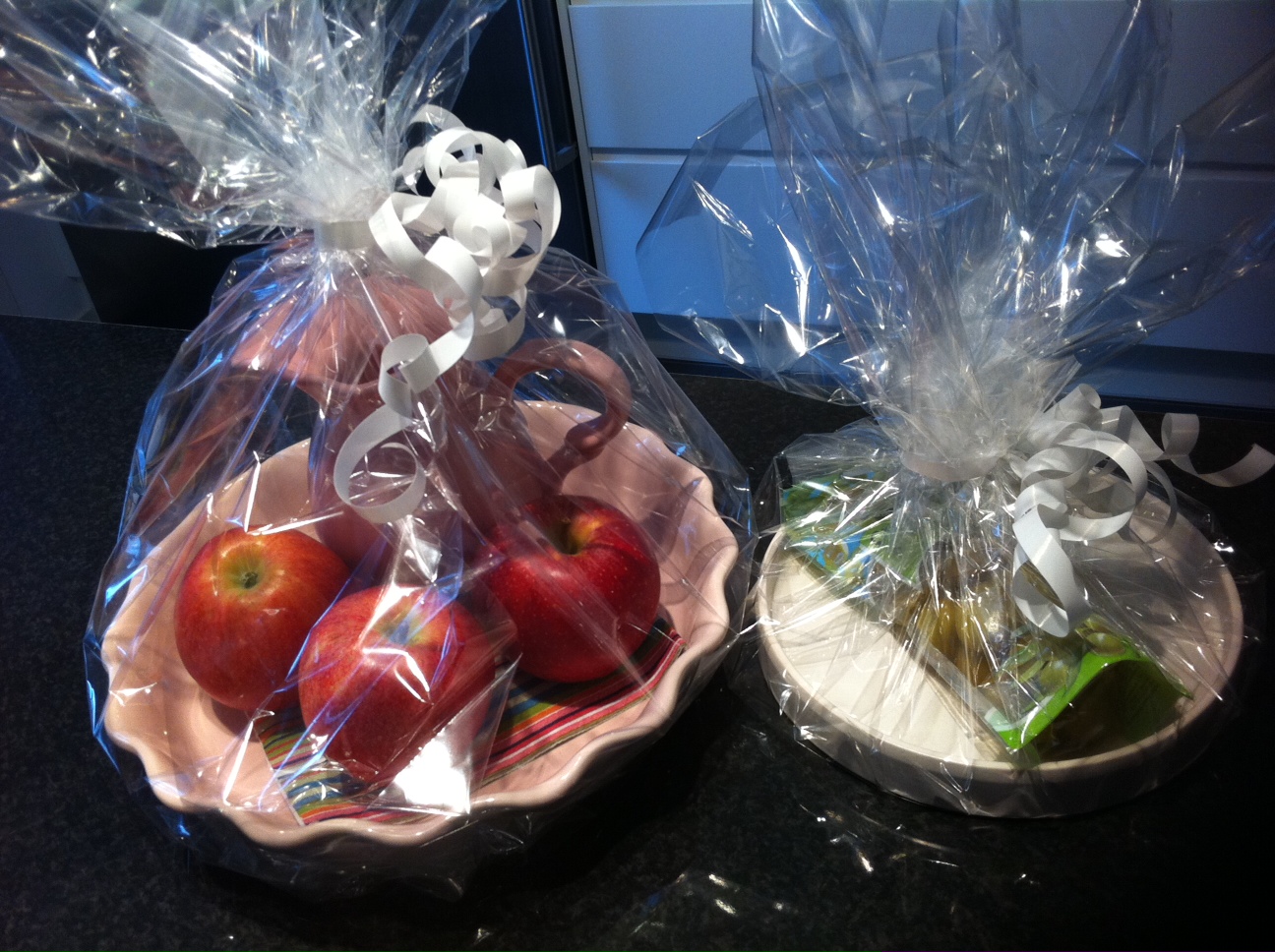 Det är en rosa pajform med tillhörande vaniljsåskaraff, samt ett vitt fat att ha olivolja, balsamvinäger o sånt på, som kan stå på köksbänken. Hon blev jätteglad, så roligt!